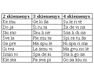 1) žodžio ilgį (skiemenų skaičių žodyje);