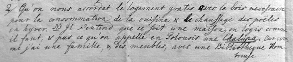 7. Qu‘on nous accordat le logement gratis avec le bris necessaire pour la consommation de la cuisine & le chauffage des poėles en hyver. NB Il n‘entend que ce foit une maison, on logis comme il faut, & pas ce qu’on appellee en Polonois une Chalupa. Car com me j’ai une famille & des meubles, avec une Bibliotheque Nombreuse (VUB RS F2-DC53_19-2, 1783 11 09)