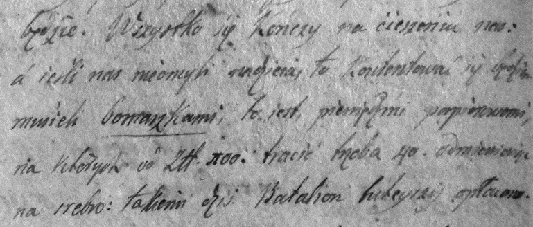 8. kontentować się będziem muśieli bomaszkami, to iest pieniędzmi papierowemi na których od Złt 100. tracić trzeba 40. odmieniaiąc na srebro: takiemi dziś Batalion tuteyszy opłacono... (1793 06 31, VUB RS, F16-9h).