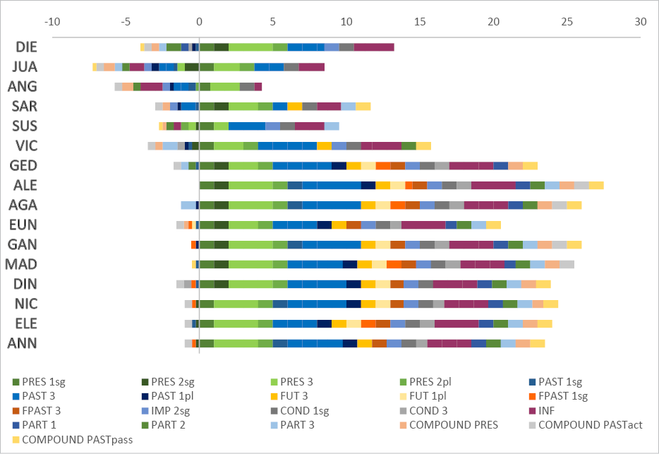 The frequentative past tense is a rather simple and transparent tense that is, however, rather infrequent and therefore acquired late. This is reflected in the repetition task as six beginning speakers up to GED do not even attempt to reproduce it. The more advanced speakers who did reproduce the form show a clear preference towards FPAST3 overextending 1SG. Given the morphological analogy, the reasons for this are likely to be the same as those for overextending PAST3. Speakers GED, ALE, AGA, and EUN do not use the FPAST1SG form in their free production. Speakers GAN, MAD, DIN, NIC, ELE, and ANN do use it although the data is insufficient to confirm acquisition. Considering the failure to reproduce the elicited sentence, further investigation into the distinction between the forms in -au and in -o would be necessary.