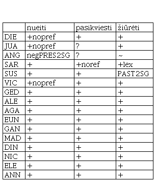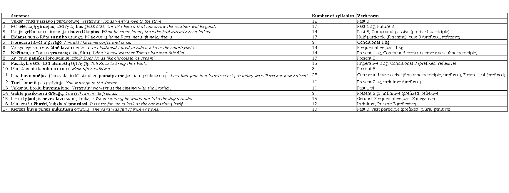 Due to the focus on flectional morphology the infinitive form itself was not a target; however, three forms of different complexity occurred in the natural meaningful sentences. One was prefixed nueiti ‘to go (away or to a certain place)’ (perfective meaning), one was prefixed and contained a reflexive marker pasikviesti ‘to invite someone to one’s place’ and a third one without any additional markers žiūrėti ‘to watch’.