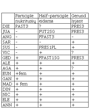 Three different participles were included in the task: the genitive form of the masculine past participle (the nominative occurs in compound tenses) nukritusių ‘fallen’, feminine of the half-participle eidama ‘~while going’, and the gerund lyjant ‘~raining’ (given the rare occurrence of this form in natives’ speech, the most typical construction lietui lyjant was chosen). Interestingly, the repetition task results show a very different situation of each of the forms. It should be said in advance that half-participle forms appear in free production of only three most advanced speakers (NIC, ELE and ANN) and EUN, while very few instances of gerund forms appear in DIN, ELE and ANN. Participles, both present and past, occur in many of the participants free production; however, they are only used as adjectives (no compound tenses are formed) up to advanced stages of the post-basic continuum.
