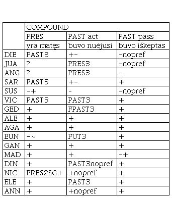 The suffixed and non-suffixed stems do not seem to be treated differently; both are successfully reproduced. The same can be said about the reflexive particle, which was nearly never omitted. Interestingly, three post-basic variety speakers omitted PAST3 used as a copula, which is obligatory in the past in Lithuanian.