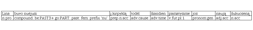 2) *JUA: Lina eina ki [/] pirkyklai i... tada dabar turi naujas... šitą. [n:pro v(go):pres3 n:~dat conj? adv:time adv:time v(have):pres3 pronom:acc]