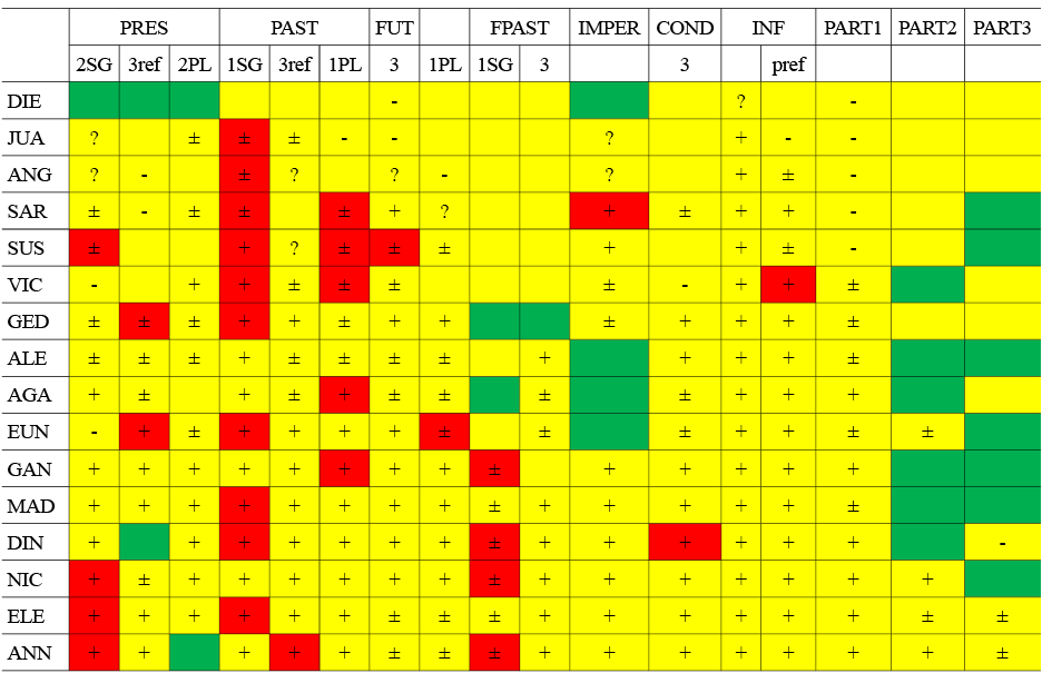In the current analysis, comparison of the repetition test results with free production is made in some more interesting cases. Table 12 summarizes the outcomes of the sentence repetition task by indicating the form being present (+), the form being present on certain lexemes (±), cases of sporadic presence with uncertainty of function (?), the form found in formulas and alike (-) or being absent (empty cell). The marking of the table cells appears in yellow when the task performance corresponds to free production, in red when the speaker underperforms and in green in cases of overproduction when compared to free production.
