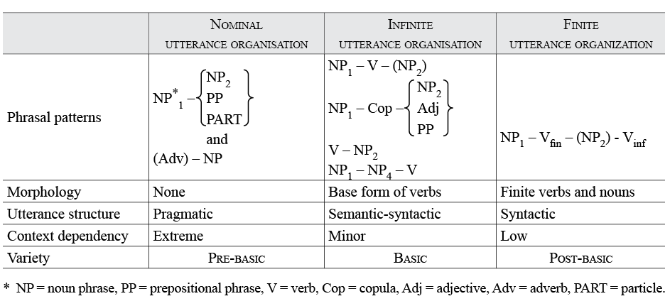 Turning back to the learner-varieties perspective, already Klein (1986: 71-74) noticed the interplay of factors that affect the correct repetition or absence of items and the role of learner varieties. In learner varieties that have not yet incorporated a determinate grammatical feature, that item, especially in other than the initial and the final positions of the utterance, will not be reproduced. Table 1 briefly summarizes the main features of learner varieties. The entire language acquisition process is a continuum; however, the first very significant qualitative step occurs when the learner’s interlanguage starts to incorporate verbs. This allows the speaker to construct structured phrases and, therefore, be rather efficient in communication. For this reason, it was called the basic variety. The basic variety still has no morphology, usually the most frequent form in the input is used of a given word and carries only the lexical meaning. Another important qualitative step in the process of acquisition occurs (however, some learners never go beyond the basic variety) when a learner starts to notice the existence of different morphological forms and to associate them with different functions. This is true for L2 production; nonetheless, receptive skills can often exceed the production by far, and this is partly what the specific task analyzed in this paper was aimed at.