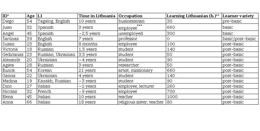 The participants of the study were foreigners who at the time of the study were living in Lithuania and had plans to live there at least in the nearest future (i.e. not in exchange programs). Table 2 presents the information about the sixteen research participants. The participants are listed according to their learner variety and sequence in the post-basic continuum, as determined in previous works (Ramonaitė 2015a).