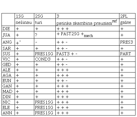 DIE’s data, where he repeats the targeted present tense and imperative forms even though he never uses them himself, shows that these forms are rather transparent and make part of the receptive or passive knowledge of Lithuanian L2.
