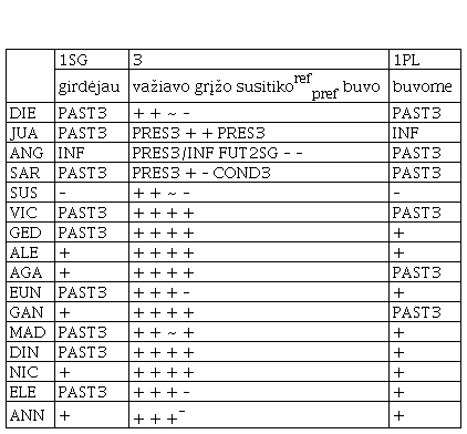 Of the six past simple tense forms that occurred in the EI task, two were targeted for the morphological person form (girdėjau PAST1SG of girdėti ‘to hear’ and buvome PAST1PL of būti ‘to be’), two were 3rd person forms with the difference that one is a suffixed stem (važiavo from važiuoti ‘to go/drive’), and the other one is without a suffix (grįžo from grįžti ‘to return’), one was a prefixed form with the reflexive particle (susitiko from susitikti ‘to meet’), and the last one was a form of the verb būti ‘to be’, used as a copula, which in Lithuanian is optional in the present tense but obligatory in the past.