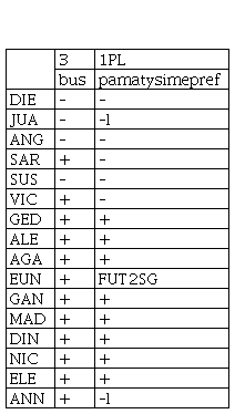 The overextension of PAST3 onto 1PL is less frequent and occurs only in the pre-basic, basic and speakers in the beginning of the post-basic continuum. The indication of plural subjects in the sentence was evidenced by su broliu ‘with brother’. This could be another indicator that the PAST3 form is acquired first in the past tense and is used as a certain base form of the tense.