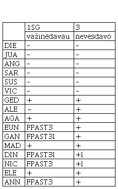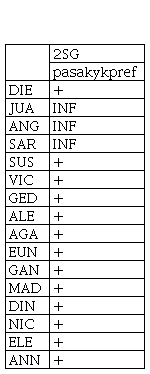 A different behavior is exhibited by the SUS who has just passed over to the post-basic variety and is very conscious of different forms having different functions; she has just not yet acquired all of them. This seems to be reflected in her non-reproduction of the other (1SG and 1PL) forms but correct reproduction in most PAST3 forms.