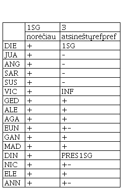Only three (of total six) present tense forms were intentionally targeted in the task. It was the 2SG, 3ref (containing a reflexive particle) and 2PL. The 2SG form in the task was turi ‘you have (to)’. This form (infinitive turėti ‘to have (to)’) was used in the task because it differs from the 3rd person form of the same lexeme only in the syllable stress: turì 2SG and tùri 3SG. The results in Table 3 show that two of the basic variety participants (JUA and ANG) reproduced a non-target form or did not reproduce it at all. One participant (VIC) modified the form into a conditional of the 3rd person.