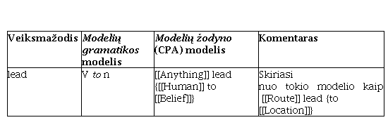 Po visų vartosenos modelių analizės etapų parengiamas tam tikro veiksmažodžio modelių aprašas, pavyzdžiui, veiksmažodžiui attend nustatyti 3 vartosenos modeliai (žr. Pattern Dictionary of English Verbs)14: