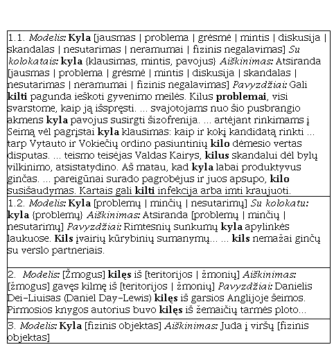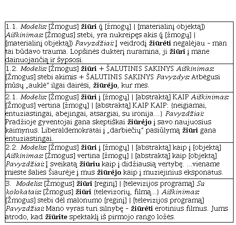 The aim of this paper is to present a pilot study which applies the framework of Corpus Pattern Analysis (CPA, Hanks 2004) to analyse some Lithuanian verbs which form part of the basic vocabulary. CPA draws on the insights of the corpus-driven language analysis and contextual and functional theory of meaning: a meaning of a word is associated with a specific lexical and grammatical environment, e.g. corpus patterns which represent an interconnection of lexical and grammatical elements. The CPA procedure is one of the several corpus-driven methods differing from the pattern grammar (Hunston, Francis 2000) in the way that CPA not only uses typical grammatical categories (e.g. word classes) but also introduces semantic values (e.g. semantic types) to distinguish different senses of a word. Semantic types are often the main separator of meanings, especially when two verb senses are associated with the same grammatical pattern. Concerning learners’ dictionaries, CPA could provide learners with more detailed usage data, and this could lead to a better understanding