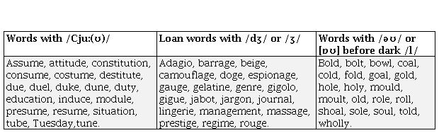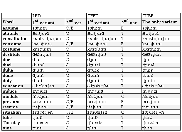 Table-2 provides the manifestation of phonetic changes in Cju:(ʊ)/ sequences in the three phonetic dictionaries.