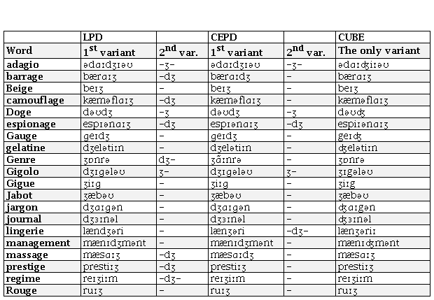 The modern non-anglicised first variants with /ʒ/ occurred11, 10, and 13 times out of 20 in LPD, CEPD and CUBE, respectively. The survey results indicated the preference for modern forms in the words ending in -age, which matched the CUBE data. While LPD consistently suggested /ʒ/ and provided /dʒ/ as a secondoption, CEPD results weremore flexible. For example, ‘barrage’ and ‘massage’ were presented in their anglicised variants without any alternatives. ‘Camouflage’ and ‘espionage’ were presented with/ʒ/ in the final position, a second variant provided for the word ‘espionage’ only.