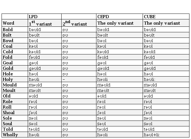 Both CEPD and CUBE limited their entries to traditional variants. LPD was the only dictionary providing the second variant with the innovative diphthong [ɒʊ] (‘holy’ being an exception).This contrasted with the survey findings, where the traditional form was prioritised more than 3.5 less than the modern variant.