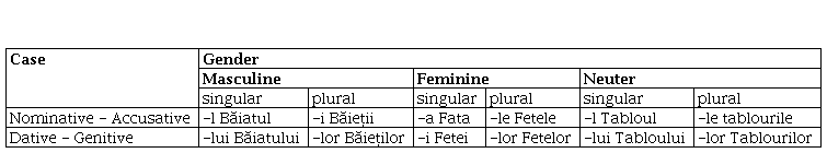 A noun/ adjective and its definite article must agree in case, number and gender. The peculiarity of the Romanian language consists of preserving the neuter gender in nouns. Initially, Latin had had neuter, but as the language evolved, most neuter nouns were assimilated to masculine. “In Italian and Roumanian, however, the "neuter" involves, not pronouns, but nouns, and is not simply a sub-division of the masculine. Morphologically speaking, on the basis of the situation in Italian and in almost (but not wholly) all Roumanian "neuters," we seem to be faced withnouns belonging to one gender in the singular and to the other in the plural; this is the basis of the term ambigene 'belonging to both genders'.” (Hall 1965).