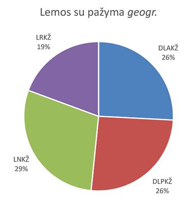 DLKŽ su pažyma geogr. buvo rasta 30 lemų. Pasirinktuose dvikalbiuose žodynuose tokios lemos pasiskirsto taip: daugiausia LNKŽ: 29 ., DLPKŽ ir DLAKŽ 26 ., o mažiausiai – LRKŽ – 19 . (žr. skritulinę diagramą).
