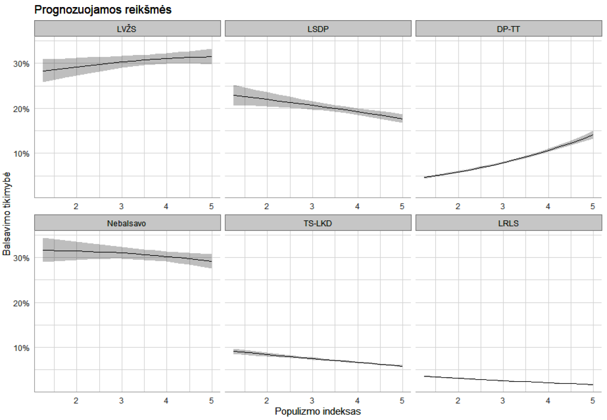 Pažvelgus į modelio prognozuojamas vidutines reikšmes pagal populizmo antielitistinį indeksą, kontroliuojant kitus veiksnius (1 pav.), matyti, kad, didėjant indekso reikšmėms, labiausiai didėja tikimybė balsuoti už DP-TT – esant mažiausiai populizmo indekso reikšmei, modelis prognozuoja 3 proc. tikimybę balsuoti, o ties didžiausia populizmo indekso reikšme prognozuojama tikimybė padidėja iki 13 proc. Nedidelis kilimas matomas ir LVŽS atveju (ties mažiausia reikšme – 27 proc., ties didžiausia – 31 proc.). Likusiose kategorijose didėjant reikšmėms matomas tikimybių mažėjimas, įdomu pažymėti, kad tokia tendencija išlieka ir nebalsavusiųjų kategorijoje. Tyrimuose Vakarų valstybėse populizmo nuostatos kartais siejamos su „kritiško piliečio“57 sąvoka, teigiama, kad piliečiai nėra pasyvūs ir ciniški politikos atžvilgiu, o kaip tik gali būti gana aktyvūs, nors ir kritiški58. Tai galėtų būti vienas iš paaiškinimų, kodėl nebalsavimo tikimybė nepadidėja kylant populizmo indekso reikšmėms. Nors patvirtinimui reikėtų atskiros analizės.