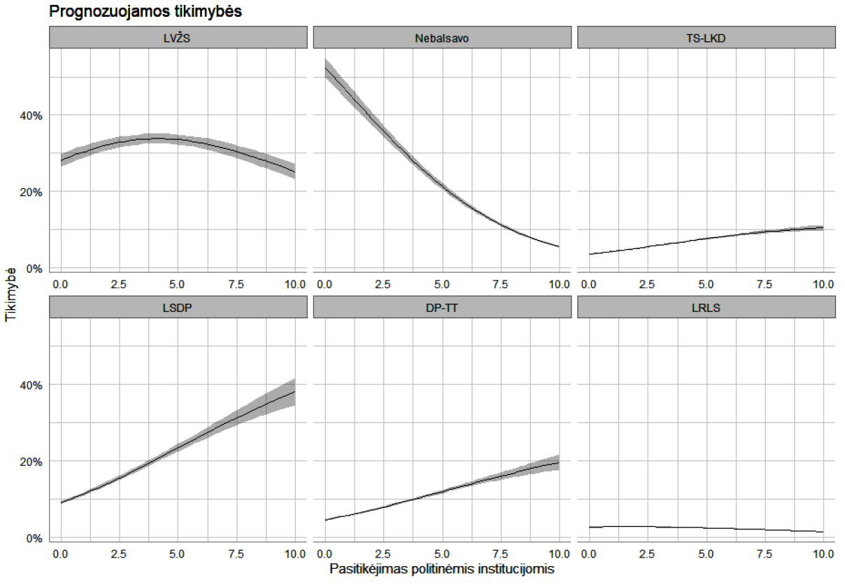 Žvelgiant į modelio prognozuojamas reikšmes pagal pasitikėjimo politinėmis institucijomis indeksą (kontroliuojant kitus veiksnius) (2 pav.), matyti, kad, didėjant pasitikėjimui, labiausiai didėja tikimybė balsuoti už 2012–2016 m. kadencijos partnerius LSDP (nuo 6 proc., kai pasitikėjimo reikšmė minimali, iki 36 proc., kai ši reikšmė didžiausia) bei DP ir TT (nuo 3 proc., kai pasitikėjimo reikšmė minimali, iki 17 proc., kai reikšmė didžiausia), tai patvirtina, kad šį pasitikėjimą galima labiau sieti su konkrečių valdžioje esančių / buvusių partijų vertinimu. Tiesa, čia iš konteksto kiek iškrinta TS-LKD atvejis – jų elektoratas taip pat yra labiau pasitikintis politinėmis institucijomis. O kalbant apie LVŽS, matyti, kad didžiausia tikimybė balsuoti už šią partiją yra, kai politinio pasitikėjimo reikšmės vidutinės (34 proc.), ir yra mažesnė, kai politinio pasitikėjimo reikšmės mažos (28 proc.) ir didelės (24 proc.). Taigi partija pataiko į „vidutinį“ rinkėją. Ir akivaizdu, kad didelis nepasitikėjimas susijęs su nedalyvavimu rinkimuose.