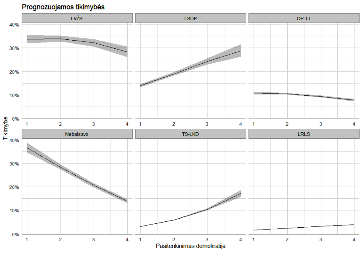 Nagrinėjant prognozuojamas reikšmes pagal pasitenkinimo demokratija kintamąjį (3 pav.), atsiskleidžia kiek kitoks vaizdas. Didesnis pasitenkinimas siejamas su didesne tikimybe balsuoti už dvi tradicines politines jėgas – LSDP (nuo 14 proc., kai pasitenkinimas mažiausias, iki 28 proc., kai pasitenkinimas didžiausias) ir TS-LKD (nuo 3 proc., kai pasitenkinimas mažiausias, iki 17 proc., kai pasitenkinimas didžiausias). DP ir TT nematomas šio kintamojo efektas. O LVŽS atveju efektas taip pat nėra didelis (nuo 33 proc., kai pasitenkinimas mažiausias, iki 28 proc., kai pasitenkinimas didžiausias).