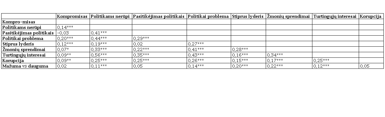 Iš koreliacijos koeficientų matyti, kad ne visi klausimai gerai koreliuoja tarpusavyje. Iš vienos pusės, tai indikuoja, kad galbūt galime kalbėti apie kelias dimensijas, kaip ir tikimasi teoriškai. Iš kitos pusės, matome ir tikrai silpnų koreliacijų. Silpniausias koreliacijas su kitais kintamaisiais demonstruoja klausimas apie kompromisus politikoje („Tai, kas politikoje vadinama kompromisu, iš tiesų yra tik savo principų išdavimas“). Šis kintamasis gana plačiai naudojamas ir kituose populistinėms nuostatoms matuoti skirtuose įrankiuose, iš kur ir yra pasiskolintas53, o šiame įrankyje teoriškai turėtų matuoti elementą, susijusį su požiūriu į valdymo sistemą ir suverenumą. Tačiau matyti, kad stipriausiai šis klausimas koreliuoja (nors koeficientai ir nėra dideli) su antielitistiniais klausimais (Politikai yra problema; Politikams nerūpi žmonės). Kalbant apie kitus klausimus, kurie priskiriami valdymo / suverenumo dimensijai, galima pasakyti, kad jie geriau koreliuoja tarpusavyje, nei su dauguma likusių klausimų. Klausimas apie mažumų teises turi stipriausią koreliaciją su klausimais apie stiprų lyderį ir žmonių priimamus sprendimus, o su likusiais koreliuoja silpniau, visi šie trys klausimai teoriškai patenka į suverenumo / valdymo dimensiją. Įdomu, kad klausimai apie stipraus lyderio valdžią ir didesnį žmonių vaidmenį priimant sprendimus koreliuoja teigiamai, pritariantys vienai atstovaujamosios demokratijos alternatyvai labiau pritaria ir kitai, nors iš pirmo žvilgsnio tai atrodo ganėtinai priešingos alternatyvos. Tai atitinka kai kurių tyrėjų nuomonę, kad populizme tai gali būti suderinta54. Tiesa, reikia pasakyti, kad klausimas apie žmonių sprendimus stipriau koreliuoja ir su kai kuriais antielitistinės dimensijos klausimais (Politikai yra problema, Politikams nerūpi žmonės, Politikai atstovauja turtingųjų interesams). Galima teigti, kad šis klausimas apie sprendimus iš dalies apima ir antielitistinę dimensiją vadovaujantis logika, kad žmonėms reikia palikti daugiau svarbių sprendimų, nes politikais jie negali pasitikėti. O stipraus lyderio klausimas su antielitistinės dimensijos klausimais susijęs silpniau ir labiau matuoja tik su valdymu susijusį aspektą. Kalbant apie antielitistinę dimensiją, čia matomos gana stiprios tarpusavio koreliacijos, neblogai koreliuoja kone visi šiai dimensijai teoriškai priskiriami klausimai. Iš konteksto kiek iškrinta klausimas apie korupcijos paplitimą, kuris su likusiais šios dimensijos kintamaisiais yra susijęs mažiausiai. Galima sakyti, kad koreliacijos atskleidžia daugiau ar mažiau panašų vaizdą, kurio ir teoriškai būtų galima tikėtis, su keliomis išimtimis.