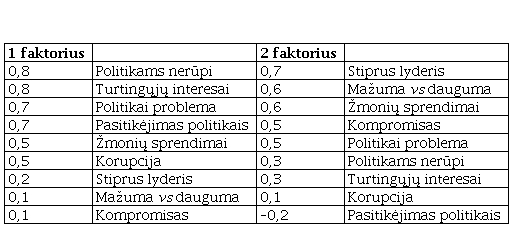Tam, kad tikrai patvirtintume, jog galima prasmingai kalbėti apie kelias dimensijas ir patikimą indeksą / indeksus, atliksime faktorinę šių kintamųjų analizę. Ji gali atskleisti, ar už ką tik apžvelgtų kintamųjų tarpusavio ryšių išties slypi latentiniai faktoriai. Atliekant šią analizę buvo naudojamas principinių komponenčių sprendimas (angl. PCA). Pasirinktas dviejų faktorių sprendimas (2 lentelė) pakankamai gerai atspindi tai, ko tikimės teoriškai (išskiriamos kelios populistinių nuostatų dimensijos) ir paaiškina 45 proc. kintamųjų variacijos. Matyti, kad su pirmuoju išskirtu faktoriumi labiausiai susiję kintamieji – politikams nerūpi, pasitikėjimas politikais, politikai problema, turtingųjų interesai. Šis faktorius atspindi antielitistinę populizmo dimensiją. O su antruoju išskiriamu faktoriumi labiausiai susiję kintamieji – stiprus lyderis, mažuma vs dauguma, žmonių sprendimai, taip pat kompromisas. Galima teigti, kad šis antrasis faktorius atspindi dimensiją, susijusią su valdymu. Tiesa, kaip jau matėme iš koreliacijos koeficientų, kai kurie kintamieji yra labiau susiję su abiem išskirtais faktoriais. Klausimas, susijęs su didesniu žmonių įsitraukimu į sprendimų priėmimą, pakankamai stipriai susijęs ne tik su antru faktoriumi, bet ir su pirmuoju. O kintamasis „Politikai yra problema“ susijęs ne tik su antielitistine dimensija, bet ir su valdymo / suverenumo dimensija. Dar galima išskirti kintamuosius „korupcija“ ir „kompromisas“, kurie yra mažiausiai susiję su atitinkamais faktoriais, tačiau juos galima sieti su išskirtinai vienu faktoriumi.