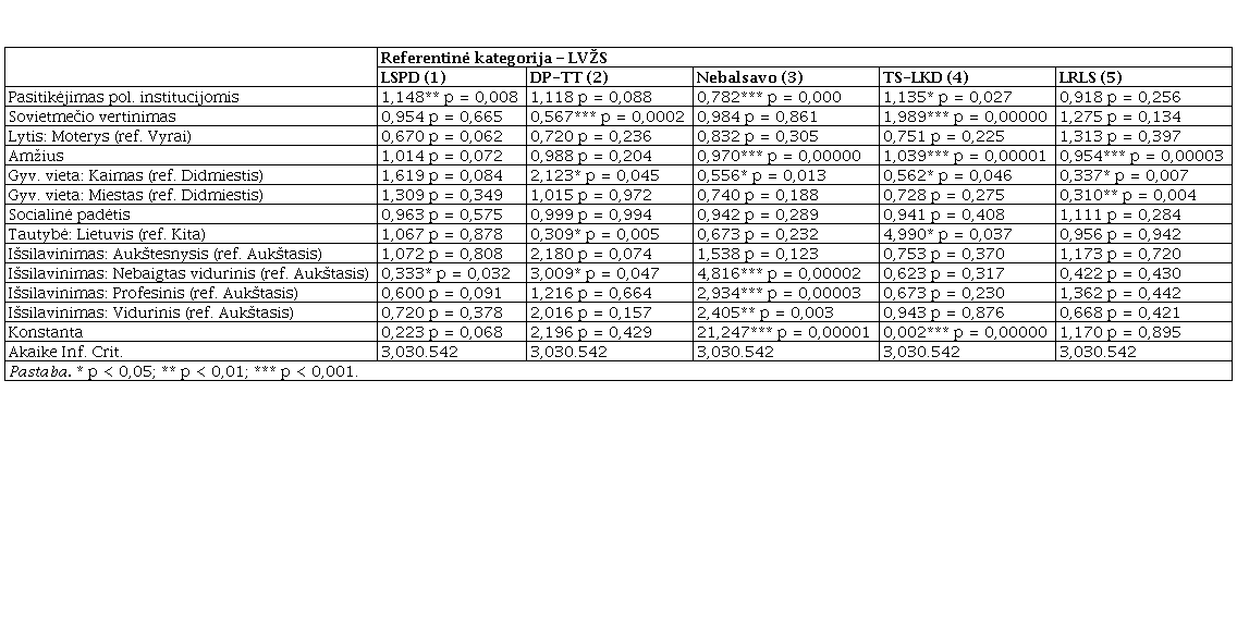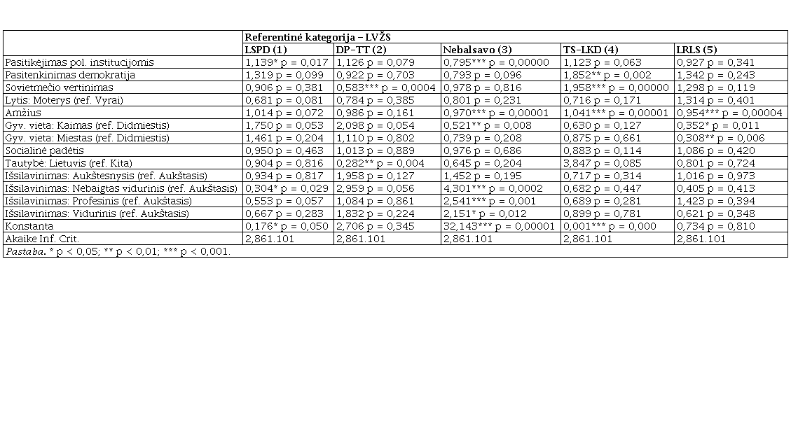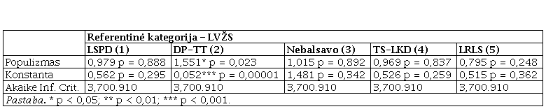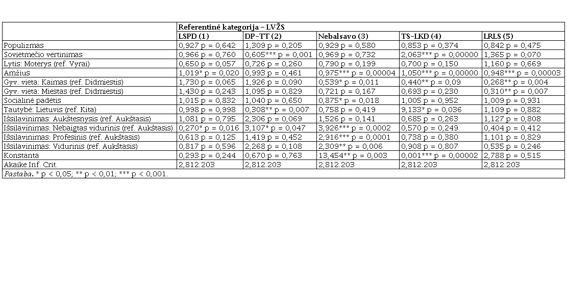 Daugianarės logistinės regresijos rezultatai (4 lentelė)56 atskleidžia, kad populizmo (antielitistinės) dimensijos skalė nėra reikšmingas kintamasis, paaiškinantis balsavimą – nė vienos partijos atveju, palyginti su LVŽS, šis kintamasis nepasiekia statistinio reikšmingo lygmens (p < 0,05). Modelis rodo, kad reikšmingai veikia sovietmečio vertinimo kintamasis – geresnis sovietmečio vertinimas didina šansus balsuoti už DP ar TT, palyginti su LVŽS, o blogesnis vertinimas didina šansus balsuoti už TS-LKD, palyginti su ta pačia LVŽS. Taip pat atskirais atvejais reikšmingai veikia amžiaus – vyresni labiau linkę balsuoti už TS-LKD, o jaunesni už LRLS arba išvis nebalsuoti, palyginti su LVŽS; gyvenamosios vietos – didmiesčio gyventojai, palyginti su kaimo gyventojais, labiau linkę balsuoti už TS-LKD ar LRLS, palyginti su LVŽS, veiksnys. O asmenys, kurių socialinė padėtis geresnė, labiau linkę balsuoti už LVŽS, palyginti su nebalsavusiais.