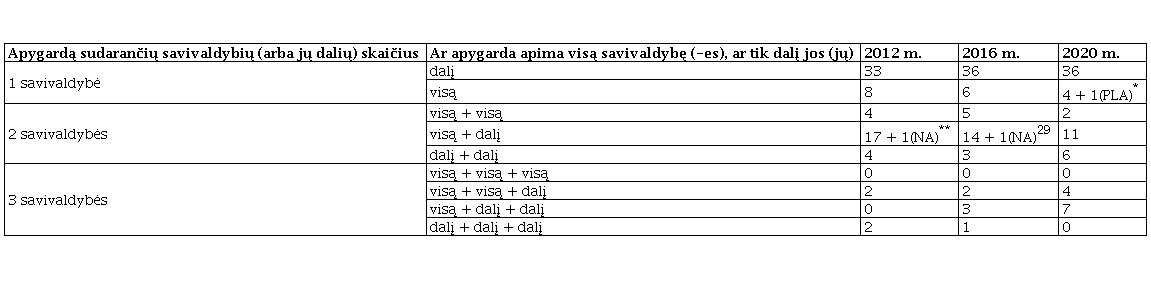 Vertinant vienmandačių rinkimų apygardų ir savivaldybių ribų sutapimus (žr. 1 lentelę) idealiausiu variantu reikėtų laikyti tuos atvejus, kai apygarda sutampa su savivaldybe arba, didmiesčių atveju, savivaldybės ribose yra kelios tik iš jos apylinkių sudarytos apygardos. Tik iš didžiųjų miestų sudarytų apylinkių skaičius palaipsniui didėja – 2020 m. tokių buvo 36. O su savivaldybės teritorija sutampančių apylinkių skaičius sumažėjo iki 4 (Šilutės, Telšių, Utenos ir Vilkaviškio). Iš vienos savivaldybės apylinkių sudarytų apygardų variantas geriausias ne tik organizacine prasme, bet kartu leidžia užtikrinti geresnį rinkėjų atstovavimą, nes tikėtina, kad toje pat savivaldybėje rinkėjų politinės preferencijos bus panašesnės, nei iš skirtingų savivaldybių apylinkių sudarytose apygardose. Tiesa, paprastai tam tikrų, kartais gana didelių, rinkėjų politinių preferencijų skirtumų tarp savivaldybės centro ir jos kaimiškųjų apylinkių iš esmės visada išlieka. Be to, yra etniniu požiūriu nevienalyčių savivaldybių (pvz., Švenčionių r., Vilniaus r.), kurių apylinkėse rinkėjų politinės preferencijos stipriai skiriasi.