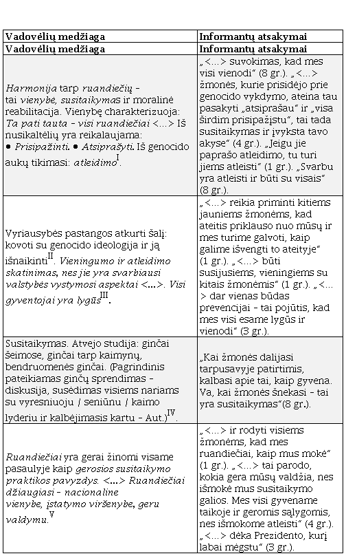 2 lentelėje pateikiama trumpa lyginamoji analizė iš ugdymo įstaigose naudojamų vadovėlių bei informantų atsakymų. Rezultatai leidžia teigti, kad vietiniai gyventojai, kalbai pakrypus link susitaikymo, pereinamojo laikotarpio teisingumo pokyčių, kartojo faktiškai vienodas konstrukcijas, rinkosi tokį patį žodyną, kuris aptinkamas ne tik akademiniuose tekstuose, bet ir yra diegiamas nuo vaikystės. Taigi daroma prielaida, jog oficialus susitaikymo apibrėžimas yra stipriai internalizuotas. Be to, ištyrus ugdymo medžiagą ir pabendravus su švietimo įstaigų darbuotojais, kurie gana dažnai akcentavo „kompetencijomis paremtą mokymąsi“, „mokymąsi per praktiką“ (2 gr.), tapo aišku, kad valdžios priežiūroje esanti švietimo ir kultūros sistema ne tik padeda formuoti vienakryptį susitaikymo supratimą, bet ir yra labai nepalanki kritiniam mąstymui. „Vadovėliniai“ informantų atsakymai parodo, jog žmonės mažai linkę garsiai reflektuoti ar atskleisti, kiek iš tiesų jie tiki šiuo iš viršaus į apačią nuleistu susitaikymo apibrėžimu. Atsižvelgus į ankstesnius tyrimus, matoma, kad valstybėje gana stipriai reguliuojama susitaikymo politika41, gautas vietos gyventojų apibrėžimas buvo ne tik palygintas su ugdymo medžiaga, bet ir peržiūrėti oficialių valstybės institucijų dokumentai bei paties šalies lyderio vieši pasisakymai. Sutaikytos Ruandos vizijos projekcija randama 2019 m. nacionalinės atminties dienos kalboje. Šalies vadovas teigia, jog išgyvenę yra tie, kurie atleidžia. Kartojasi tos pačios („mes esame vieningi“, kreipinys – „ruandiečiai“, „turime išvengti“) frazės, kuriomis kreipiamasi į tautą42. Įdomu ir tai, kad šią kalbą palyginus su 2020 m. lyderio pasisakymu, fiksuojama faktiškai identiška ir tais pačiais žodžiais nusakoma sutaikinimo idėja43. Be to, tapatybę nusakanti konstrukcija – „mes ruandiečiai“ – vartojama ir kitų nacionalinių institucijų dokumentuose44 ar net memorialų ekspozicijų aprašuose: „Toliau rasite <...>: jie įsipareigojo gyventi kartu, ne kaip hutai ar tutsiai, bet kaip ruandiečiai.“45