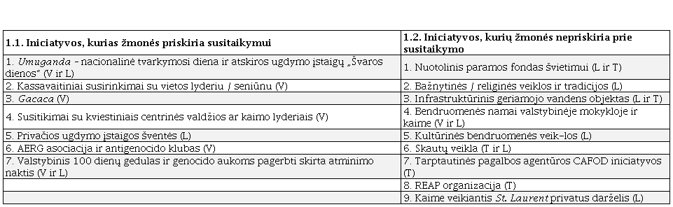 Pirmiausia, spėjimą, kad vietos lygmeniu dominuoja ne tik centro formuojamas susitaikymo apibrėžimas, bet ir jo vykdymo būdai, sukėlė užfiksuota nuolat atsikartojanti argumentacija informantų atsakymuose. Lauko tyrimo metu domėtasi, kokie būdai jiems atrodo tinkamiausi susitaikymui pasiekti. Įžvelgtas įdomus ir dėmesio vertas panašumas: 3.1 dalyje informantai vartojo panašius žodžius susitaikymui apibrėžti, o prakalbus apie veiklas, didžioji dalis jų taip pat atsikartojo. Dominavo „tinkamiausios“ praktikos, kurios, žmonių manymu, jiems „padeda sugyventi, judėti toliau, užtikrinti bendrystę, vienybę“ (1 gr.), o „vykdant susitaikymo programas, įtraukiami ir dalyvauja visi bendruomenės nariai, nes esame kaip vienis – ruandiečiai“ (4 gr.). Tokie ir panašūs atsakymai parodė, jog vietinių paminėtos iniciatyvos, jų įgyvendinimo būdai ir norimi pasiekti tikslai visiškai atitinka valdžios piešiamą susitaikymo būdo paveikslą47.