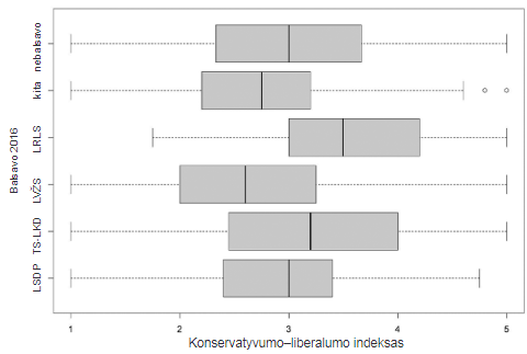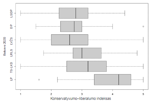 Kaip matyti iš 1 pav., didžioji dalis (pilka „dėžutė“ grafike nurodo 50 proc. reikšmių išsibarstymą) visų partijų rinkėjų spiečiasi aplink vidutinę indekso reikšmę (3), išskyrus LP rinkėjus, kurių dauguma atsiduria liberalumo, o ne konservatyvumo pusėje. Matome, kad LP rinkėjų indekso medianinė reikšmė (žymima tamsia linija dėžutės viduryje) viršija keturis ir yra gerokai atitolusi nuo kitų partijų rinkėjų medianos. Tai patvirtina, kad LP rinkėjai iš tiesų išsiskiria savo liberalumu ne vien LGBT teisių, bet ir kitais klausimais. Arčiausiai jų pagal pažiūras yra TS-LKD ir LRLS rinkėjai, o toliausiai – LVŽS rėmėjai, tačiau skirtumai tarp kitų partijų yra gerokai mažesni.