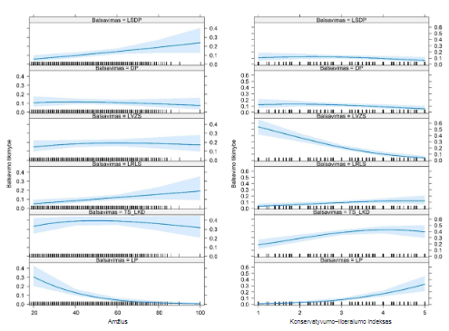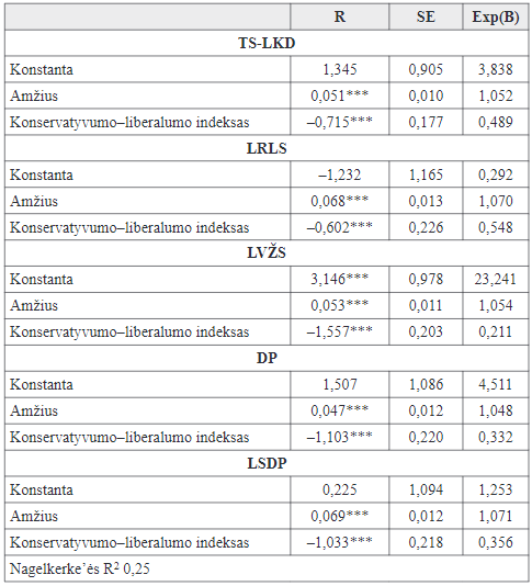 Verta pažymėti ir tai, kad, įtraukus į regresinę analizę liberalumo–konservatyvumo indeksą, amžius išlieka statistiškai reikšmingas kintamasis, turintis savarankišką poveikį tikimybei balsuoti už LP (žr. 3 pav.), nors amžius ir konservatyvumo–liberalumo indeksas koreliuoja tarpusavyje (Pearsono R – 0,35). Tai reiškia, kad vertybinis liberalumas nėra vienintelė priežastis, kodėl už šią partiją balsavo būtent jauni žmonės. Tam įtakos galėjo turėti kiti veiksniai – jaunatviškas partijos įvaizdis, naudotos komunikacinės priemonės ir kt., tačiau tai jau kito tyrimo reikalaujantis klausimas.