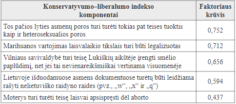 Siekiant pamatuoti skirtingų partijų rinkėjų liberalumo lygį, šie penki kintamieji buvo sujungti į vieną konservatyvumo–liberalumo indeksą, kurio didesnės reikšmės atspindi didesnį liberalumą. Skalės patikimumo Cronbacho alfa rodiklis nėra itin didelis (0,68), bet pakankamas40. Analizė rodo, kad, pašalinus bet kurį iš kintamųjų, Cronbacho alfa reikšmė nepagerėja, todėl buvo palikti visi penki indekso komponentai.