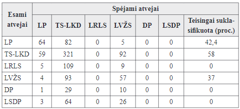 kategorijai). Verta pažymėti, kad šis modelis gana neblogai diferen- cijuoja LP ir LVŽS rinkėjus (nuspėja atitinkamai 42 ir 37 proc.), bet visai nepadeda atpažinti DP, LRLS ir LSDP rinkėjų (0 teisingai nuspėtų atvejų). Tai rodo, kad būtent LP ir LVŽS atsiduria skirtinguose naujai išryškėjusios vertybinės skirties poliuose, o kitos partijos šios skirties savo elektoratui mobilizuoti neišnaudoja.