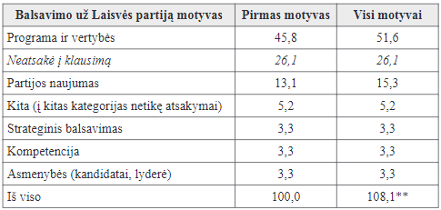 Iš 1 lentelės matyti, kad naujumą kaip motyvą iš viso paminėjo 15 proc. LP rinkėjų. Tai yra antra pagal dažnumą motyvų grupė, tačiau ji gerokai nusileidžia dažniausiai grupei – programinių nuostatų ir (ar) vertybių paminėjimams. Į šią vertybių grupę pateko tokie atsakymai kaip „patiko partijos programa“, „geriausiai atitiko pažiūros“, „labiausiai atitiko vertybės“, „nes turėjo aiškias vertybines nuostatas“, „požiūris į žmogaus teises“, „LGBT teisių klausimai“ ir pan. Verta pažymėti, kad šioje kategorijoje gana dažnai buvo minimi žmogaus teisių klausimai, o kiti specifiniai LP programiniai akcentai gerokai rečiau, pavyzdžiui, marihuanos dekriminalizavimas paminė- tas tik du kartus.