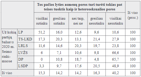 2020 m. porinkiminėje apklausoje turėjome iš „Manobalsas.lt“ klausimyno paimtą teiginį, kuriam Laisvės partijos kandidatai rinkimuose beveik vieningai pritarė29 – „[T]os pačios lyties asmenų poros turi turėti tokias pat teises tuoktis kaip ir heteroseksualios poros“. Iš 3 lentelės galime matyti, kad LP rinkėjai šiuo klausimu nėra tokie vieningi kaip pati partija, tačiau pritarimo šiam teiginiui lygiu gerokai išsiskiria iš kitų partijų rėmėjų – su šiuo teiginiu visiškai sutiko 51 proc. LP rinkėjų, greičiau sutiko 16 proc., taigi iš viso beveik 70 proc. partijos šalininkų pritaria partijos pozicijai šiuo klausimu. Tarp visų didžiųjų partijų rinkėjų visiškai arba greičiau pritariančių šiam teiginiui buvo gerokai mažiau – apie 29 proc., o tarp visų gyventojų – apie 25 proc.