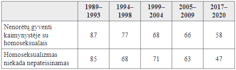 Matome, kad bendras šiam teiginiui pritariančių žmonių procentas yra gerokai didesnis nei ankstesniais metais – 2019 m. porinkiminėje apklausoje analogiškam teiginiui visiškai arba greičiau pritarė 19 proc. visų nuomonę turinčių apklaustųjų, o 2016 m. panašiam, bet švelnesniam teiginiui apie vienalyčių porų partnerystės įteisinimą pritarė vos 11 proc. apklaustųjų. Viena vertus, šiems skirtumams tam tikros įtakos gali turėti respondentų atrankos būdas (2016 ir 2019 m. apklausos buvo atliktos tiesioginio interviu būdu taikant maršrutinę atranką, o 2020 m. – internetu ir telefonu, taikant atsitiktinių nume- rių atrinkimo techniką), be to, apklausas vykdė skirtingos agentūros (2016 m. „Baltijos tyrimai“, o 2019 ir 2020 m. „Norstat“), kurios turi skirtingas atrankos ir apklausos atlikėjų kontrolės procedūras30. Kita vertus, kiti duomenys taip pat rodo Lietuvos visuomenės nuostatų kaitą šiuo klausimu. Pavyzdžiui, Europos ir Pasaulio vertybių tyrime respondentų klausiama, su kokių grupių žmonėmis jie nenorėtų gyventi kaimynystėje. Pirmojoje apklausoje, vykusioje iš karto po nepriklausomybės atkūrimo, homoseksualus atsakymuose į šį klausimą minėjo net 87 proc. respondentų, o paskutinėje apklausoje, vykusioje 2018 m., homoseksualus paminėjo 58 proc. gyventojų (žr. 4 lentelę). Analogišką tendenciją rodo kitas to paties tyrimo kintamasis – atsakymas į klausimą, ar homoseksualizmas yra pateisinamas: pirmojoje apklausoje 85 proc. respondentų minėjo, kad homoseksualizmas niekada nepateisinamas, o paskutinėje apklausoje tokių respondentų buvo 47 proc. Kaip matyti iš 4 lentelės, per pastaruosius 30 metų vyko nuoseklus nuostatų pokytis liberalėjimo kryptimi.