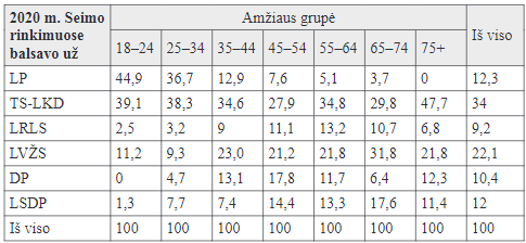 Amžius, savo ruožtu, pats savaime buvo itin reikšmingas balsavimą už LP paaiškinantis veiksnys. Kaip matyti iš 6 lentelės, jauniausioje – 18–24 m. amžiaus grupėje už LP balsavo beveik 45 proc. didžiųjų partijų rinkėjų, 25–34 m. amžiaus grupėje – 37 proc., o kitose amžiaus grupėse šis procentas drastiškai mažėja. Verta pažymėti, kad LP šiuo požiūriu ryškiai skiriasi nuo Liberalų sąjūdžio – už LRLS 2020 m. rinkimuose daugiausia balsavo vidutinio ir vyresnio amžiaus – 45–74 m. – žmonės, nors 2016 m. rinkimuose jauniausi rinkėjai buvo linkę balsuoti būtent už LRLS33.