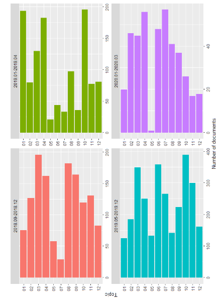 A significant cluster of documents around 0 and a complete lack of cluster around 1 are common to all probability distribution graphs γ. This means that all topics are present in many documents, i.e. the same material is repeated many times, which is typical for propaganda materials. This feature shows as well that the majority of documents are multi-topic, which is also a sign of propaganda material, i.e. due to the diversity of its topics, such material must reach the widest possible audience. According to the form of probability distribution γ topics can be divided into 2 groups: (1) with a short tail and (2) with a long tail. The long tail of the probability distribution γ for a topic is an indication that the collection contains documents that are written on this very topic, i.e. those in which the probability of belonging to a given topic is high. A short tail indicates the opposite. In the studied collection, the highest probability of one topic reaches 0.75. According to our observations, the long-tailed form of distribution is more typical for event / plot topics (which are time-bound – given the life cycle of the event), or in cases where there are special messages on a given topic in order to emphasize their importance. The short-tailed form is typical for topics that can serve as “universal” additional evidence for many propaganda purposes / campaigns.