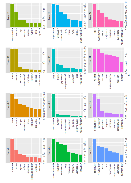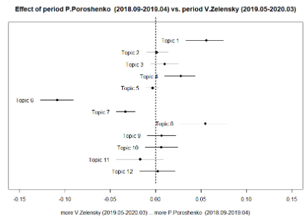 In our case, the topics that are present in many documents (the range of probability change γ is relatively narrow: from 0 to a maximum 0.6) are the following: (5) domestic policy of V. Zelensky, (7) reforms o V. Zelensky, (2) Steinmeier formula and the US support to Ukraine, (3) the Kerch Strait incident and “Russophobia,” (6) Zelensky takes office as President of Ukraine. As to other topics, the collection has several publications dedicated to each topic. In our opinion, the following topics stand out for their propaganda purposes: (10) anti-Poroshenko sentiment, (12) gas, (4) acquisition