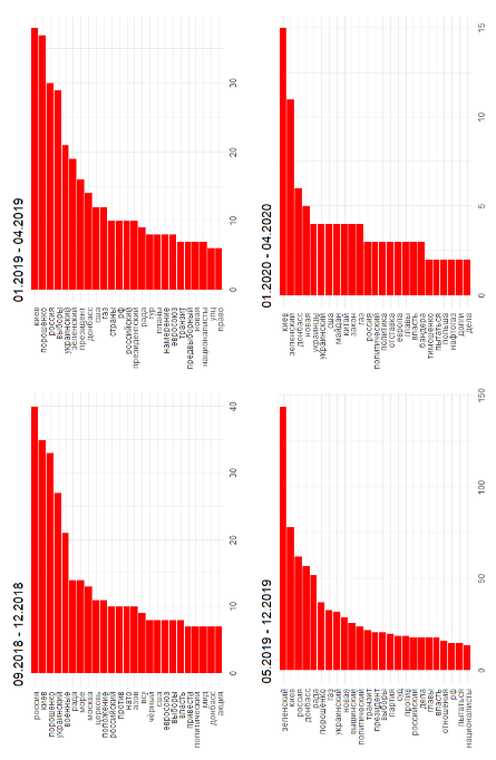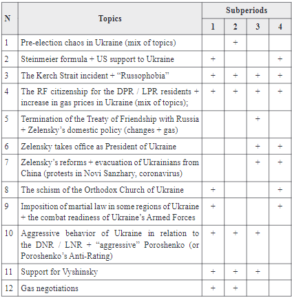 The study has analyzed analytical reports with the hashtag “#Ukraina” available on the RT website (https://russian.rt.com/trend/334986ukraina). These are 990 articles covering almost two years – from September 2018 (the site does not provide access to earlier materials) to April 2020. The whole period can be divided into 4 subperiods, each having its own specifics, and this specificity is manifested in changes in the direction of propaganda and article analytics content. The first two periods (September–December 2018 and January–April 2019) fall into Petro Poroshenko’s presidency, with the second time- frame representing the pre-election period, when the Russian propaganda network anticipated the new President of Ukraine. The next two periods (May–December 2019 and January–April 2020) represent the time of the Presidency of Volodymyr Zelensky. During the months of May to December 2019, the Russian Federation, in accordance with the propagandists at Russia Today, closely anticipated the new head of the state, and during the next period, having made appropriate conclusions, continued to pursue its own propaganda policy in view of the new conditions.