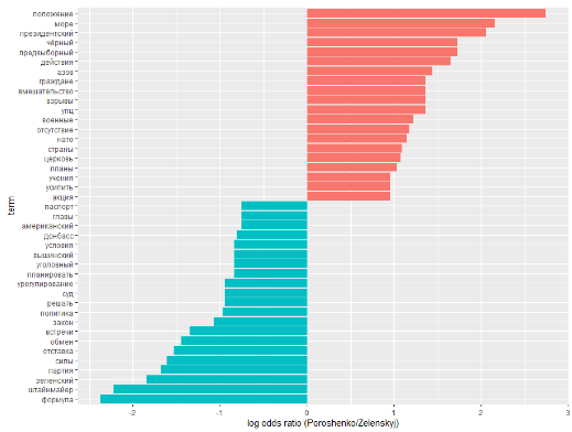 The relative frequency of the same word use in two subsets of the collection is an important characteristic, for example, the figures representing which words were more often or less often used by RT during the period of Poroshenko’s Presidency in comparison with the period of V. Zelensky’s Presidency. To do this, the indicator lor (“log odds ratio”) was calculated for each word (see Chapter 7.327 for the calculation formula). During the calculations, we considered only the words that occurred in the collection at least 10 times.
