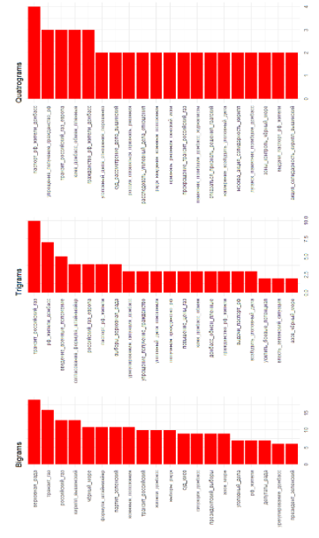 To identify the association of words in the body of data, i.e. the common presence of words in documents / collections and their frequency characteristics, two cases were considered: bigrams (established sequences of two words that stand side by side in texts) or n-grams (combinations of n words – collocations) and word correlations. “You shall know a word by the company it keeps,”28 in other words, by analyzing collocates it is possible to identify the connotative meanings and reveal the interests of the message producer.