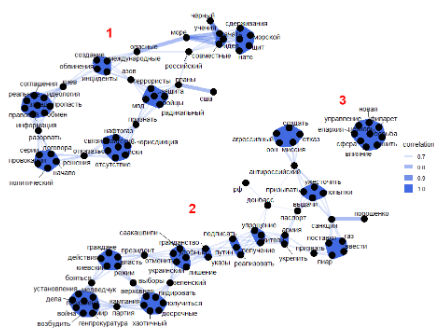 A visual representation of the network of relations between words, which takes into account both collocations and correlations of words, enabled to obtain a general event-thematic picture of the entire collection of documents. Fig. 3 shows a simplified version of this picture presented in the form of a network created by the most common words, the correlation φ between which is higher than 0.7.