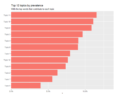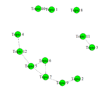 Since the number of possible topics k is a priori unknown, the possible value of k was analyzed in the range from 5 to 50. Based on calculations according to the above procedure, and taking into account primarily such criteria as coherence, as well as the simplicity or clarity of interpretation of the topic, for further work k = 12 was taken. On the basis of the STM-model 12 topics were built and keywords related to them were identified.