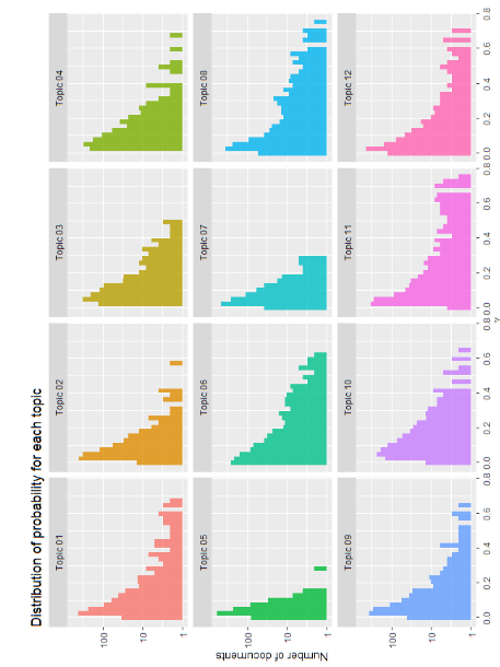 Fig. 8 shows the distribution of topics between documents. On each graph, the probability γ, which is reflected on the x-axes, varies from 0 to 1 and determines the affiliation of documents to this topic. If the column is high near 0 (many documents have a probability γ close to 0), it means that we have many documents that do not belong to the relevant topic. If there are many values around 1, it means that there are many documents that exclusively represent one topic. These distributions demonstrate how a collection of documents presents a defined list of topics.