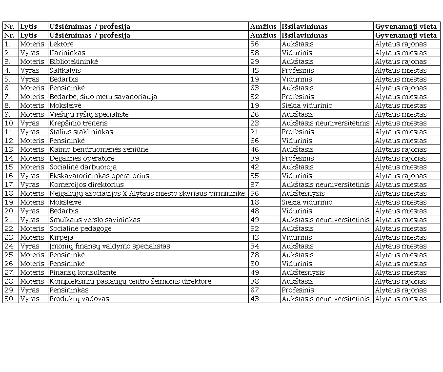 Anonimizuotas informantų sąrašas pagal deskriptyvines socialines charakteristikas