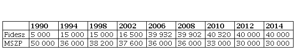 Tačiau, žvelgiant iš organizacinės perspektyvos, šias partijas sieja daug kas bendro. Pirmiausia, išskyrus pačią pokomunistinės transformacijos pradžią (1990–1994 m.), kai abi partijos kartu paėmus teturėjo vos 14 proc. mandatų pirmajame demokratiškai išrinktame šalies parlamente25, jos pakaitomis vadovavo visoms vėlesnėms vyriausybėms. Nors dažniausiai jos sudarydavo koalicijas su kitomis partijomis, dėl gerokai didesnio mandatų skaičiaus jos paprastai dominavo vykdomojoje valdžioje. Pasinaudodamos savo įtaka, palyginti su kitomis politinėmis jėgomis, jos iki 2004 m. išplėtojo plačiausią palaikymo infrastruktūrą šalies teritorijoje. Be to, abi jos palyginti gerai įsitvirtino valstybinėse ir vietos savivaldos struktūrose ir užmezgė glaudžius bendradarbiavimo saitus su pagrindinėmis centristinėmis Europos politinėmis partijomis. Galiausiai, nors tarpusavio programinių skirtumų ir jų reikšmės šių partijų veiklai negalima visiškai ignoruoti, jų nereikėtų ir pervertinti, ypač turint omenyje tai, kad nuo 2006 m. „Fidesz“ perorientavo savo ekonominės politikos programą į kairę ir net atsigręžė į Jánoso Kádáro, valdžiusio šalį 1956–1988 m., politinį palikimą26.